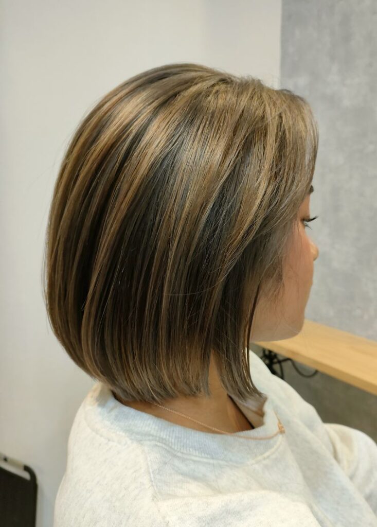 髪の根元を少しだけ暗くしグラデーションを作ることで髪を動かした際に下の毛の根元も暗いので陰影が付きバレーヤージュっぽい筋感が生まれます。