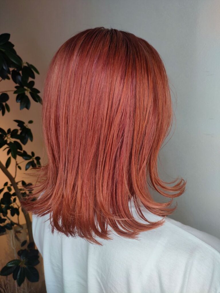その後のカラーの際に根元は少し毛先より暗めの薬剤を使用し全体のピンク味を綺麗に調整していきます。