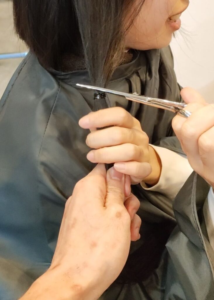 このお客様は毛量が多く、髪も硬いので重すぎるボブではなく表面にしっかり段を入れ、動きのあるスタイルにしていきます。